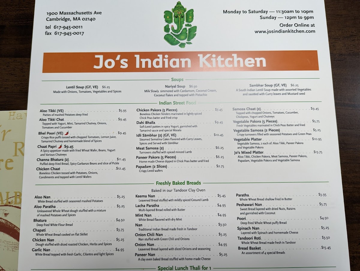 Welcome to Jo's Authentic Indian, your gateway to the vibrant flavors and culinary traditions of India right in the heart of Cambridge, MA. Nestled at 1900 Massachusetts Ave, this charming eatery has quickly become the go-to destination for those seeking genuine Indian cuisine that resonates with authenticity and warmth. With a phone call to +1 617-945-0709, you're just a step away from ordering a taste of home.